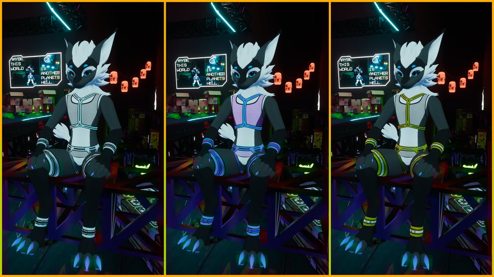 - Arm/leg collars(3128 Vertices),Fishnet top(1754 Vertices), Harness(1558 Vertices), Leg harness(3775 Vertices).